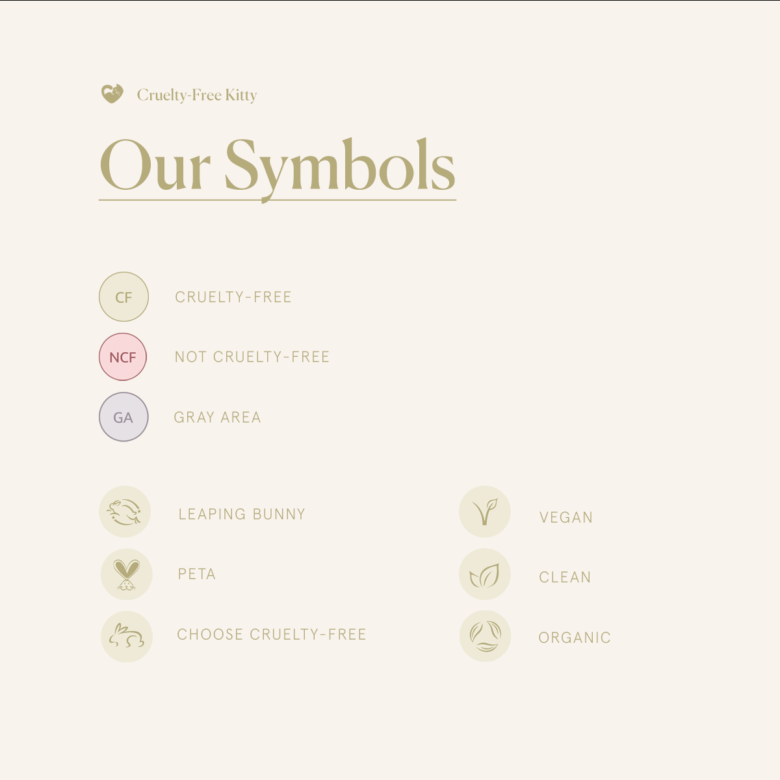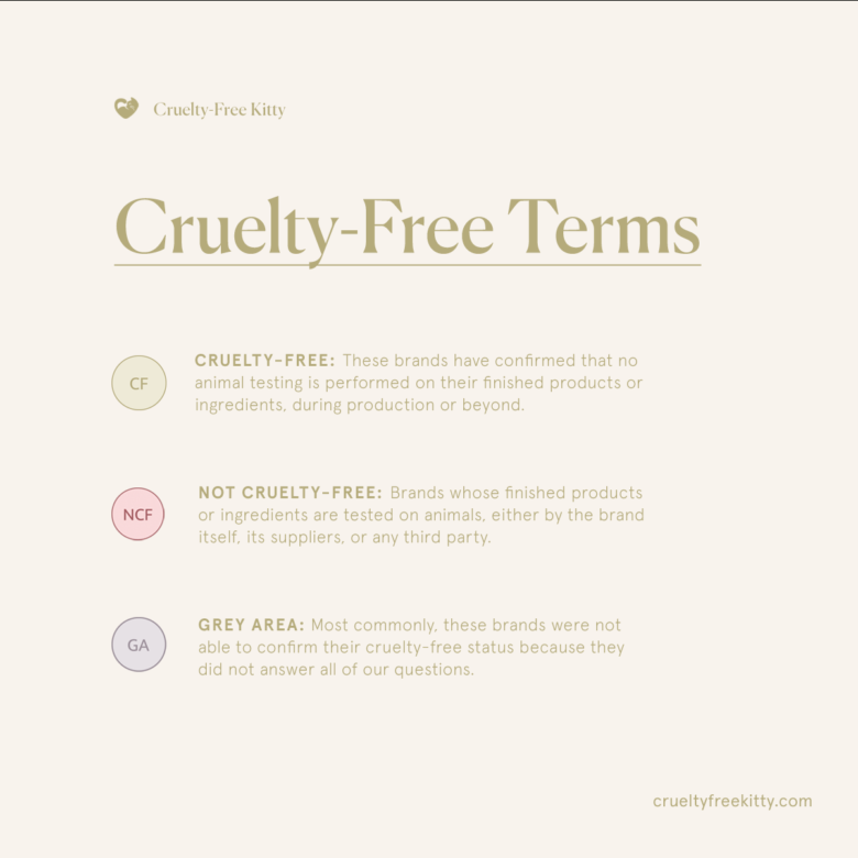 Grey Area: Most commonly, these brands were not able to confirm their cruelty-free status because they did not answer all of our questions. We recommend avoiding these brands as they may test on animals.