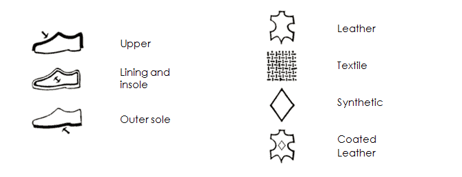 Vegan shoes are made of a variety of synthetic and natural materials. But how can you determine whether the shoes you're buying are vegan? Footwear manufacturers must label their products with an indication of the materials used for the upper, lining, insole, and outer sole. This information is usually available on a tag or sticker on the shoes themselves, with symbols like the ones depicted in the graphic below.